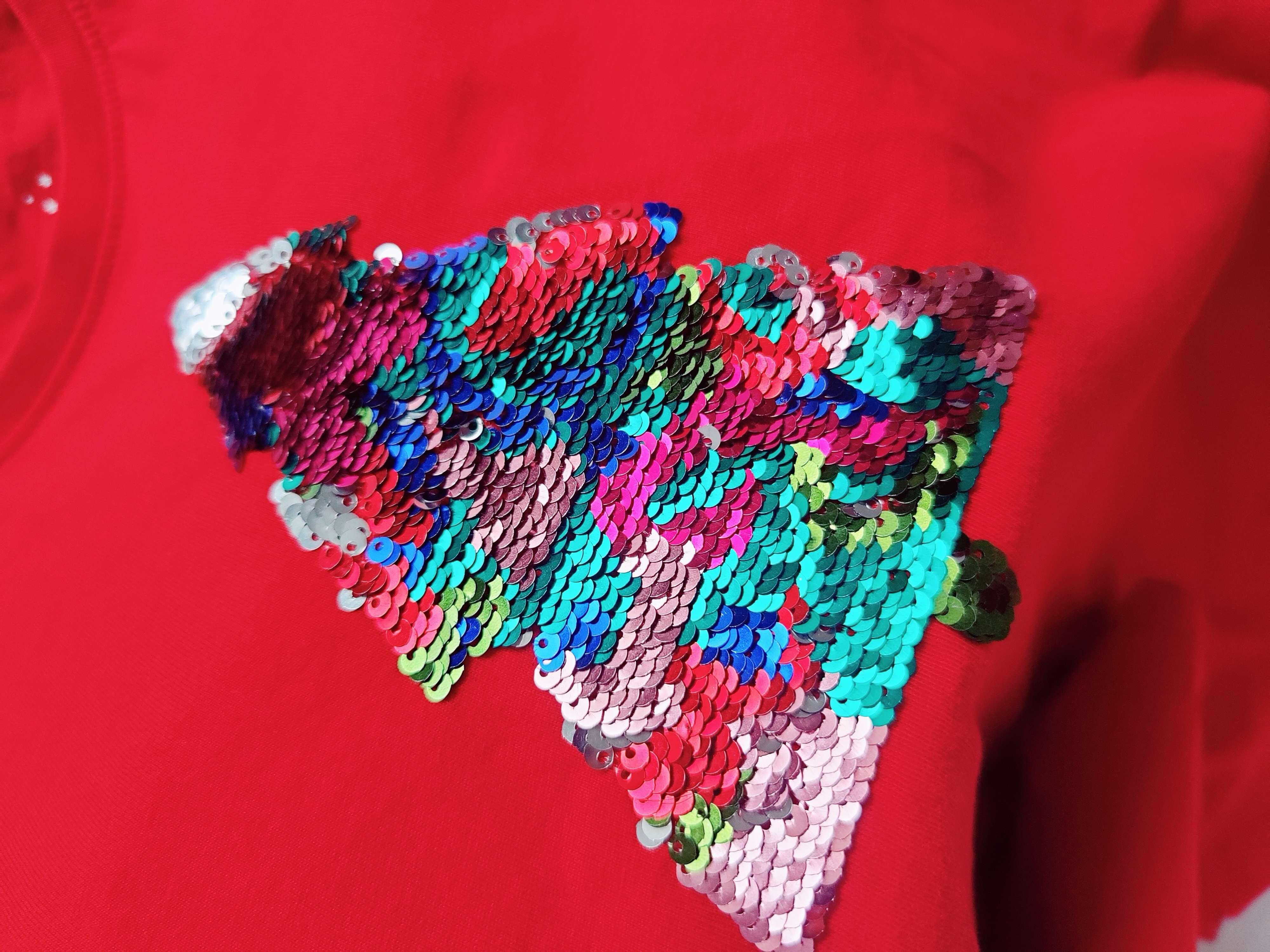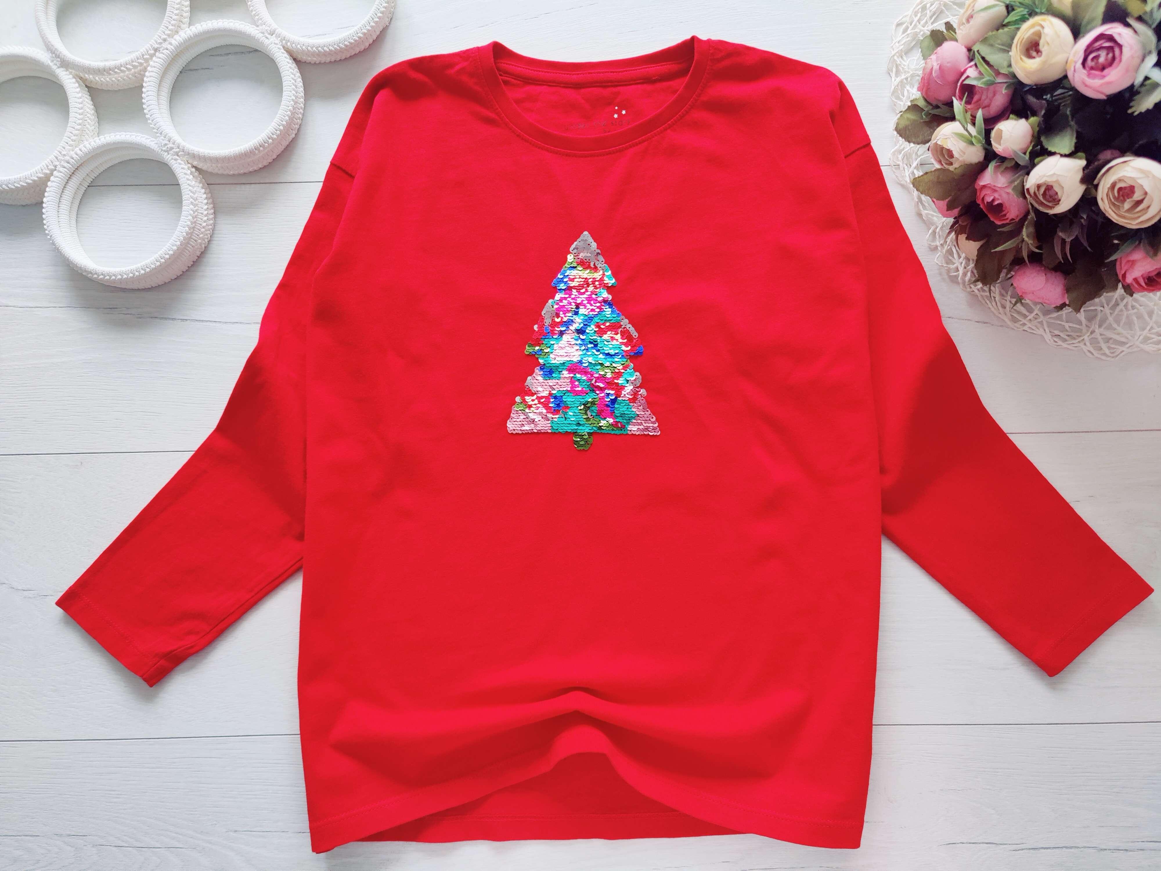 10 років, зріст 140 Червоний новорічний реглан ялинка з паєтками